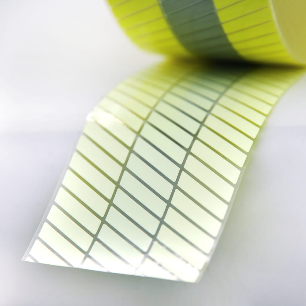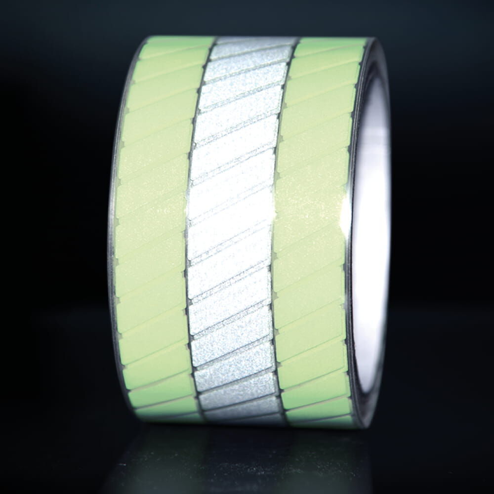 Der Reflextransferfilm hat eine quer verlaufende Segmentierung und verfügt längs zwischen den retroreflektierenden und fluoreszierenden Bereichen über einen Zwischenraum. Dadurch wird das Material deutlich flexibler und weniger anfällig für Verschleiß.