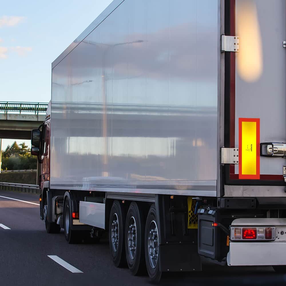 Das Heckwarntafel-Set für Sattelauflieger und Anhänger enthält zwei Tafeln, sogenannte Halbmarkierungen, der Größe 565 x 196 mm.