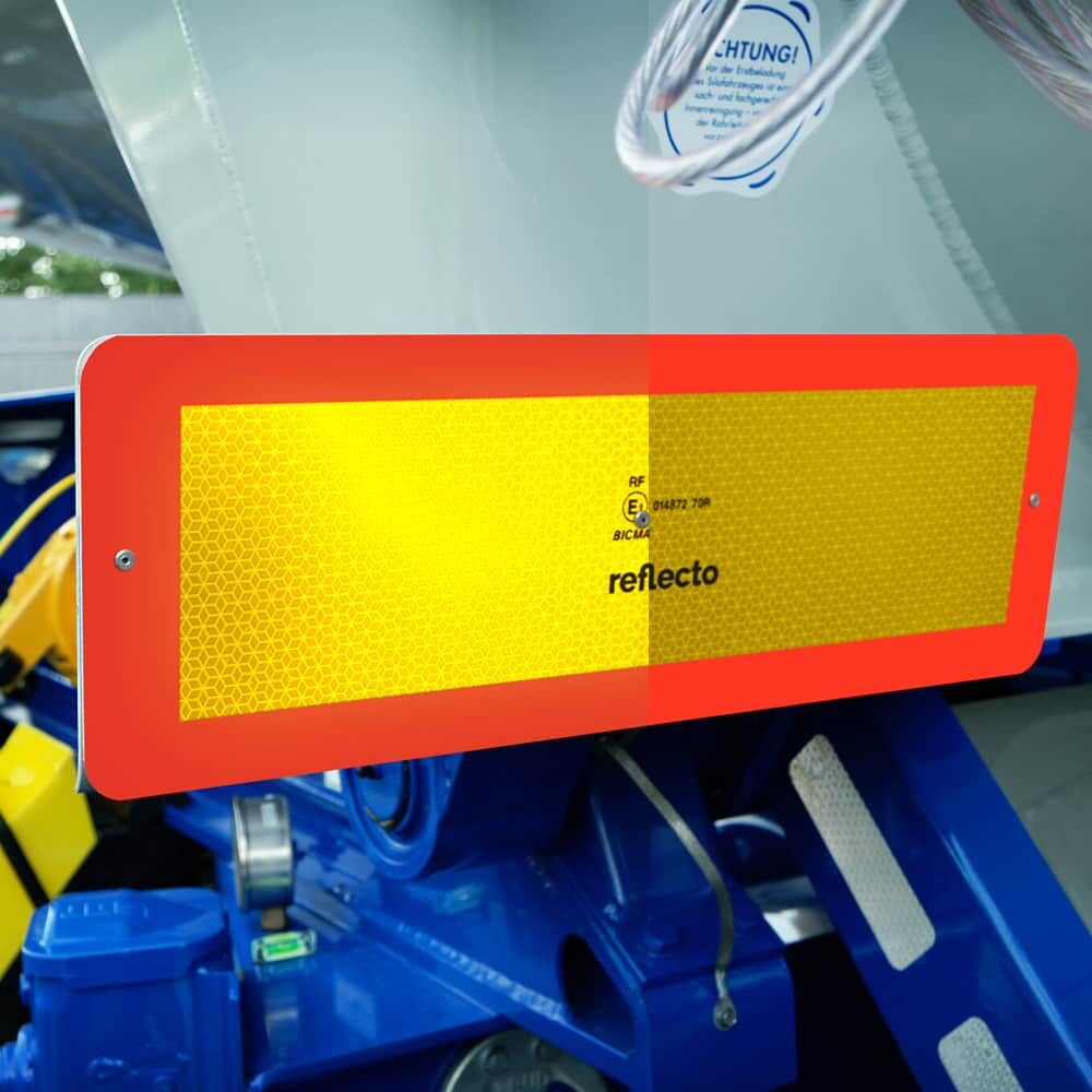 Die gelbe Innenfläche besteht aus leistungsstarker Reflexfolie der Rückstrahlklasse RA3 (Aufbau C), während die rote Umrandung aus fluoreszierender Folie ist. Somit entspricht die Heckwarnmarkierung der ECE-Regelung 70.01 (Klasse 2).