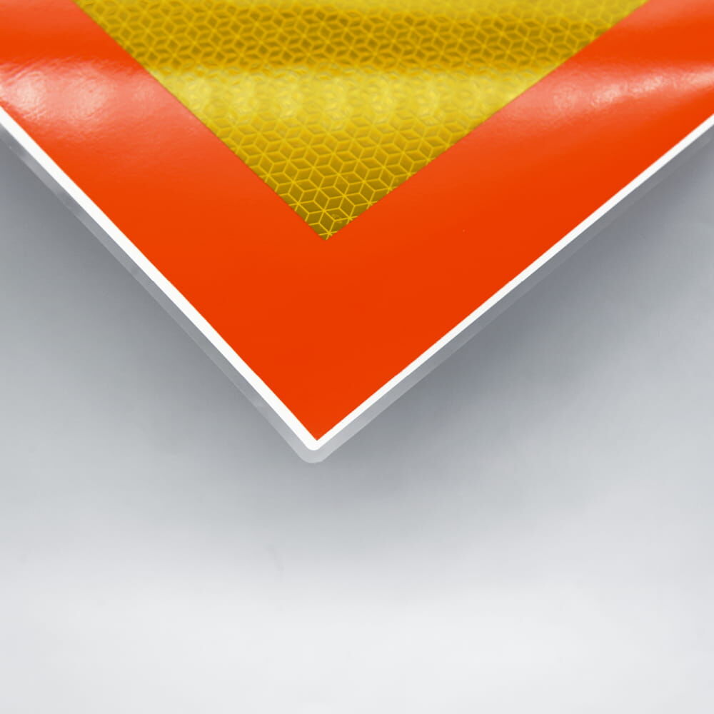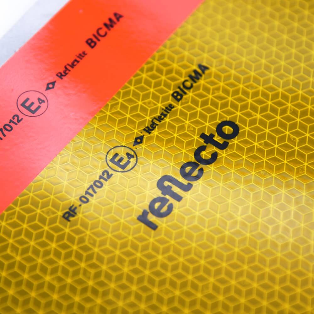 Die gelbe Innenfläche besteht aus leistungsstarker Reflexfolie der Rückstrahlklasse RA3 (Aufbau C), während die rote Umrandung aus fluoreszierender Folie ist. Somit entspricht die Heckwarnmarkierung der ECE-Regelung 70.01 (Klasse 2).