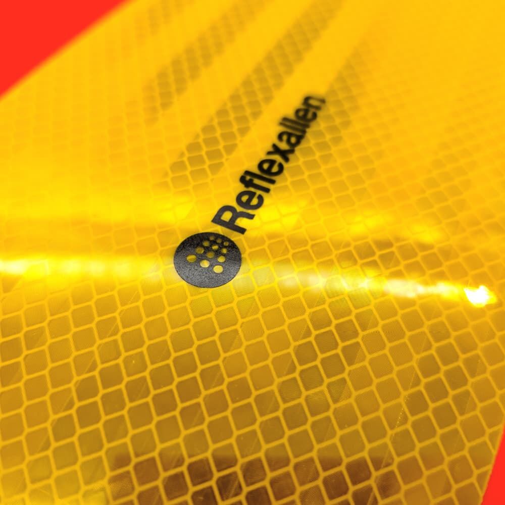 Gelbe Hochleistungsreflexfolie (3M™ Diamond Grade™ DG³ RA3/C Serie 4091) auf tagesleuchtender Folie in Rotorange.