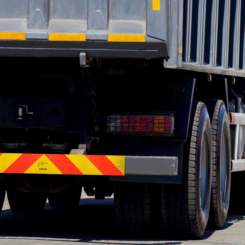 Die gelben Streifen bestehen aus leistungsstarker Reflexfolie der Rückstrahlklasse RA3 (Aufbau C), während die roten Streifen aus fluoreszierender Folie sind. Somit entspricht die Heckwarnmarkierung der ECE-Regelung 70.01 (Klasse 1).