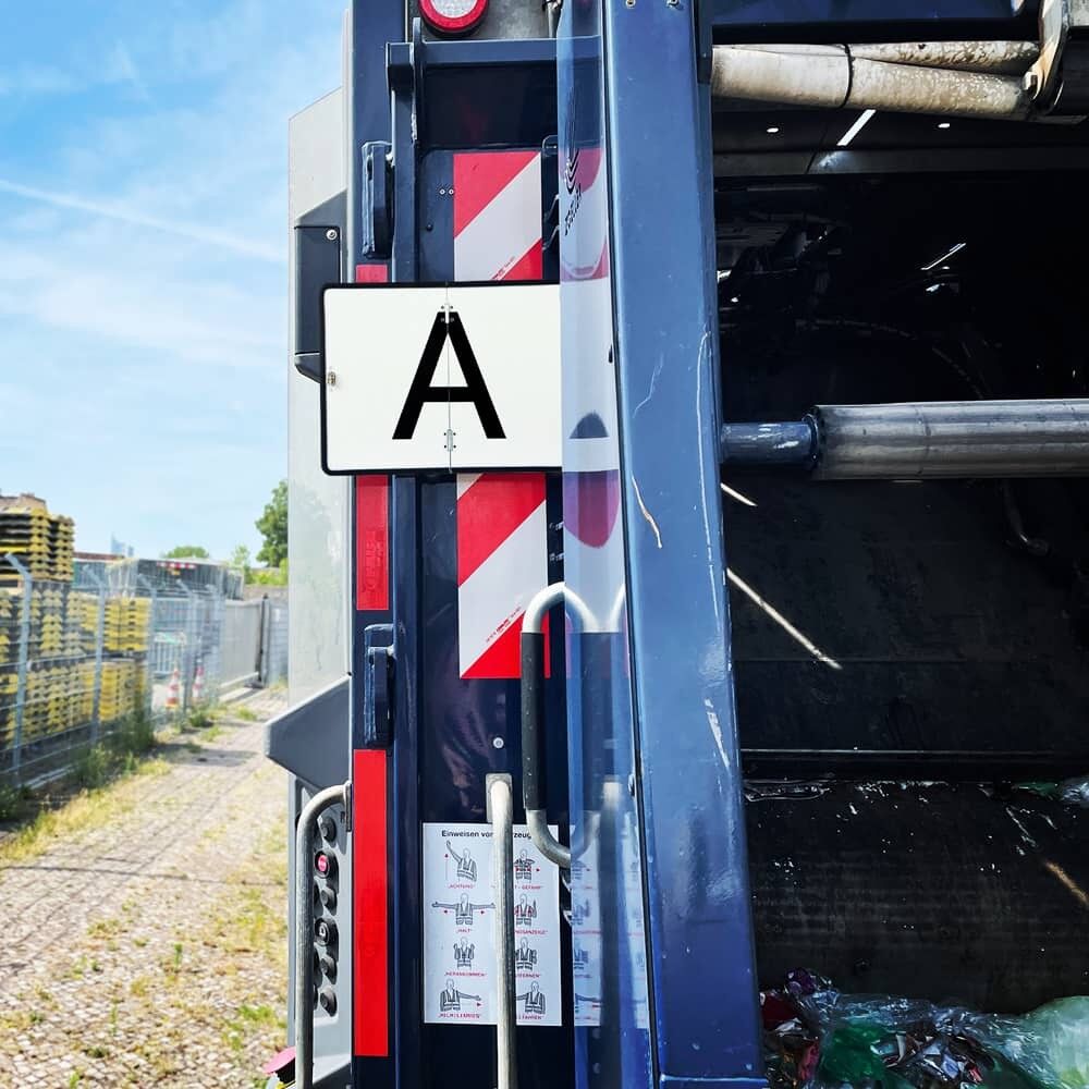 Fahrzeuge, die gewerbsmäßig Abfälle einsammeln und transportieren müssen mit zwei rechteckigen, reflektierenden, weißen Warntafeln. Die A-tafeln sind während der Beförderung vorn und hinten am Fahrzeug senkrecht zur Fahrzeugachse und nicht höher als 1,50 Meter über der Fahrbahn deutlich sichtbar anzubringen.