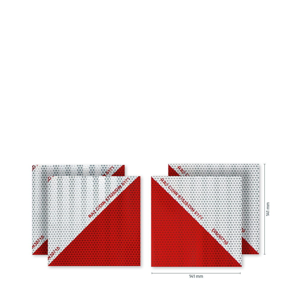 Das Set besteht aus zwei oder vier Zuschnitten leistungsstarker Warnmarkierungsfolie von 3M™. Diese erfüllt die DIN 30710 hinsichtlich Reflexionsstärke und Farbgebung, was an dem entsprechenden Aufdruck auf der Folie erkennbar ist. Damit eignen sich die Zuschnitte zur Kenntlichmachung von Fahrzeugen mit Sonderrechten nach § 35(6) StVO. Wichtig: Nur die Ausführung mit den Maßen 141 x 564 mm entspricht den geforderten vier Normflächen laut Straßenverkehrsordnung.