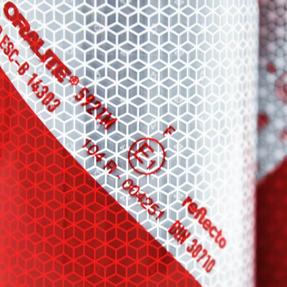 Die Reflexfolie ist mit dem erforderlichen DIN 30710-Aufdruck (sowie TPESC-B und ECE 104 Klasse F) versehen und erfüllt auch hinsichtlich der Rückstrahlwerte alle gesetzlichen Vorgaben: Sie verfügt über verspiegelte Mikroprismen, welche einfallendes Licht erst mehrfach in sich selbst reflektieren, bevor sie es nach außen wieder abstrahlen. Die Rückstrahlung wird dadurch intensiviert und über weite Winkel hinweg ermöglicht. So werden auch gekennzeichnete Fahrzeuge sofort wahrgenommen, die sich von der Seite nähern oder am Straßenrand parken.