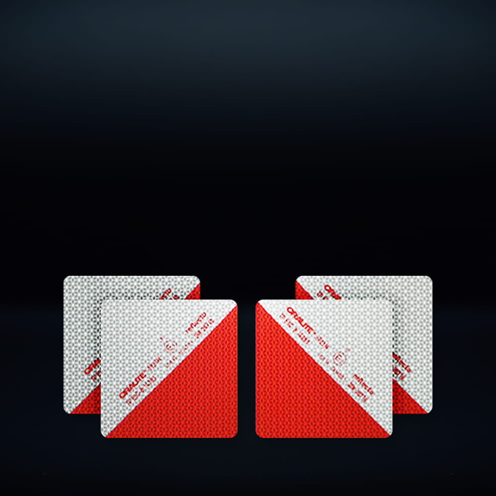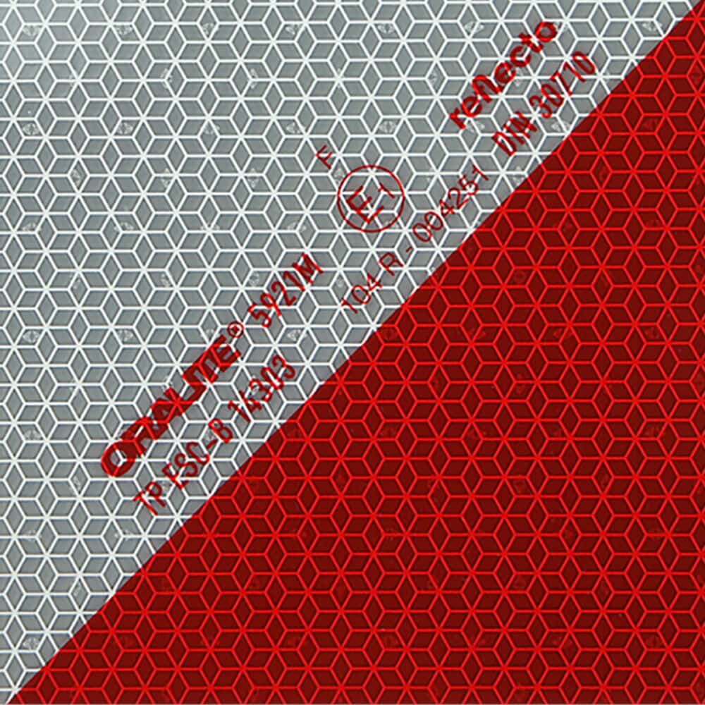 Das Ausgangsmaterial bildet die leistungsstarke Reflexfolie ORALITE 5921M von Orafol. Mit ihrem mikroprismatischen Aufbau reflektiert sie stark und entspricht der Reflexionsklasse RA2/C. Damit gewährleistet sie, dass gekennzeichnete Fahrzeuge auch bei schlechten Lichtverhältnissen und aus weiten Winkeln sofort gesehen werden.