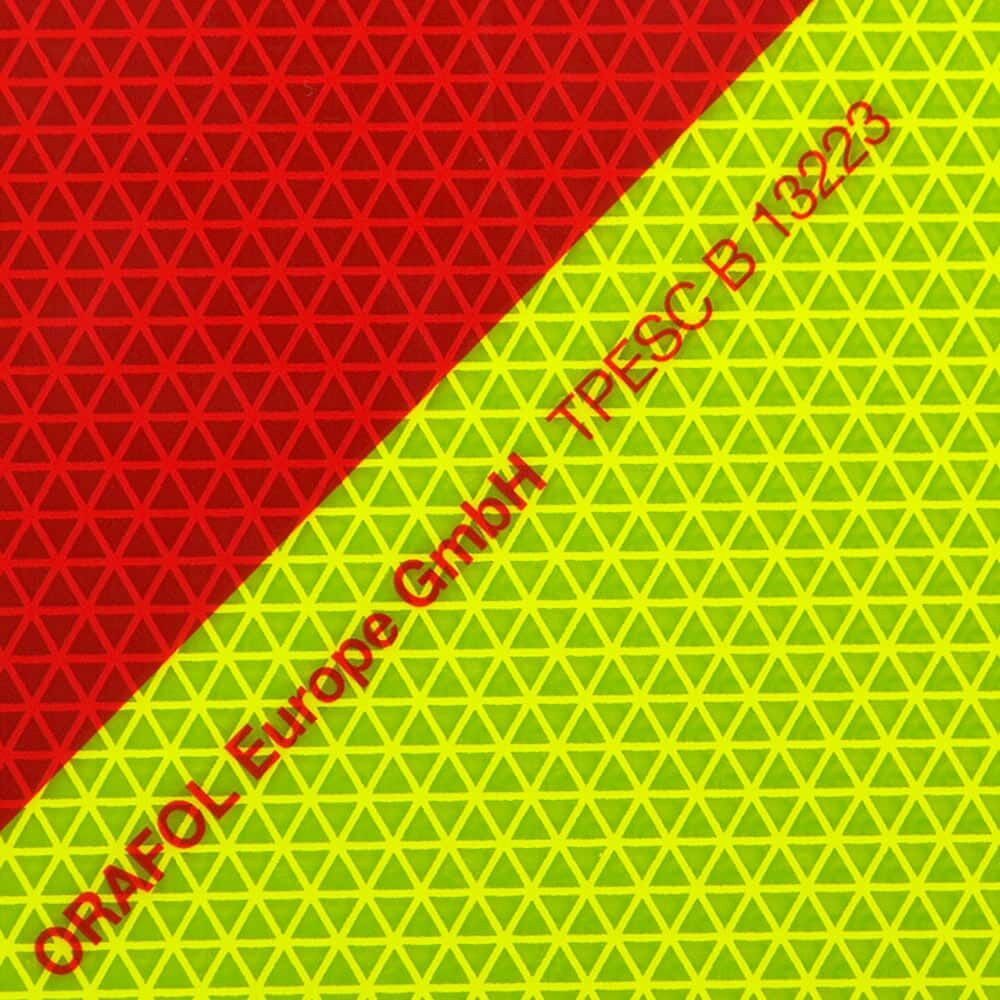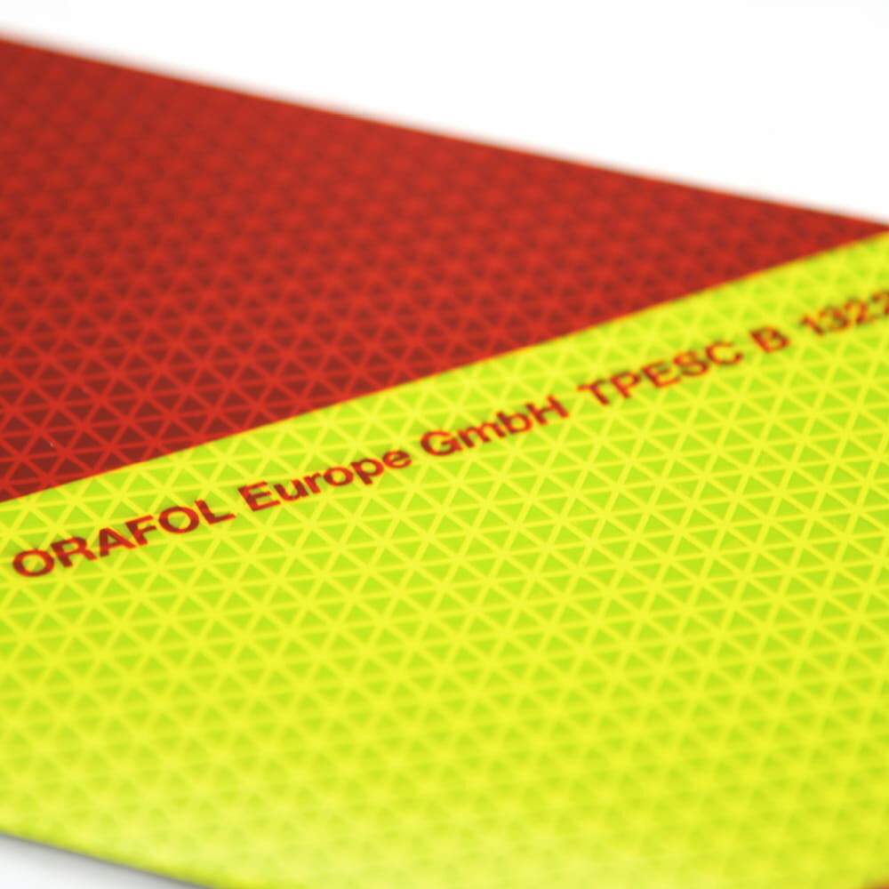 - Material: ORALITE VC 612 Flexibright Fleet Marking Grade von Orafol (erfüllt DIN 14502-3:2022, TPESC-B Zulassung) auf Magnetfolie