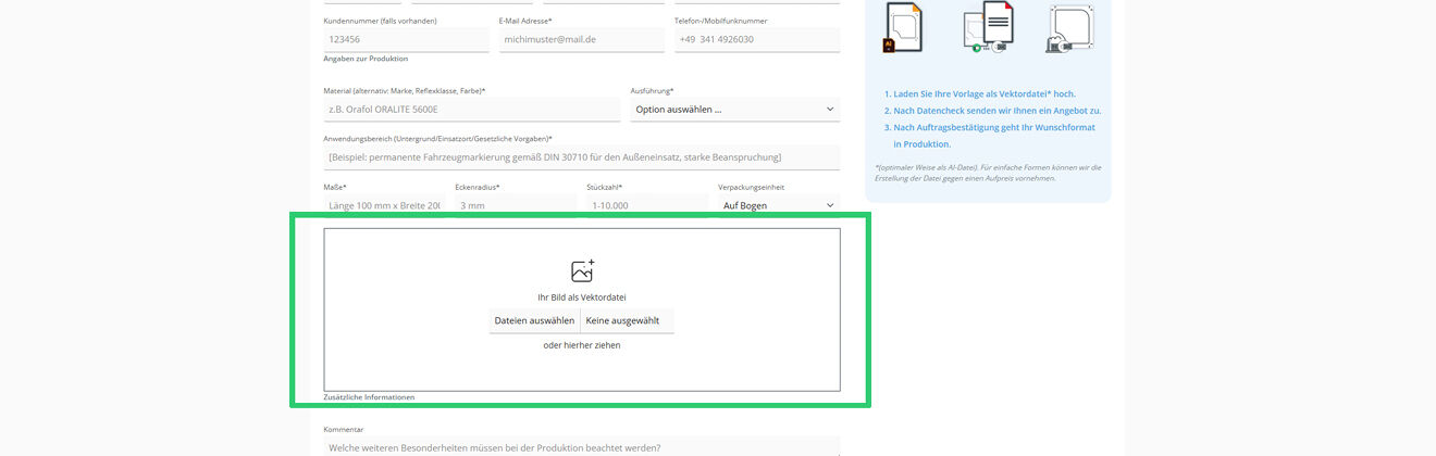 Bei Sonderanfragen können Sie jetzt direkt im Formular eine Datei (z. B. Skizze, Foto oder Vektordatei) hochladen – das beschleunigt die Klärung und spart Rückfragen.