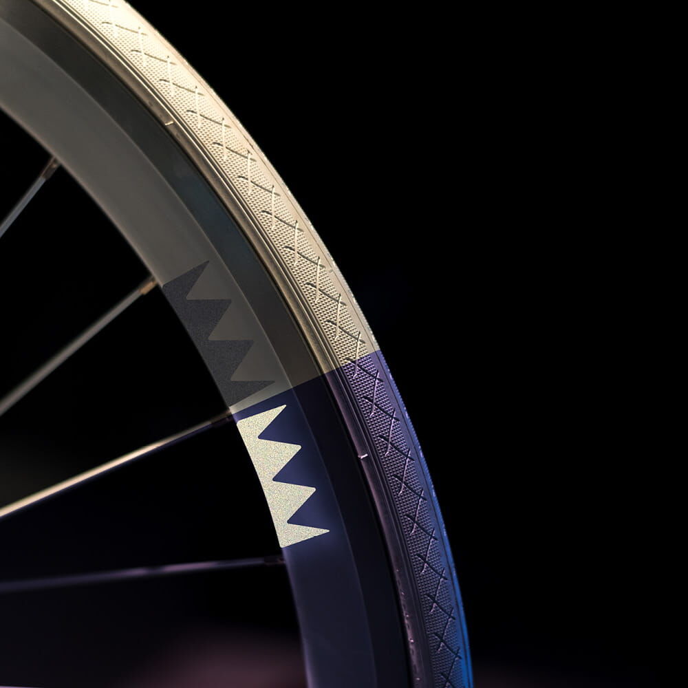 Im Video sind unsere klassischen Felgenrandsticker zu sehen, die seitlich auf der Felge angebracht werden. Diese Variante wird dagegen zwischen den Speichen auf der Felgenmitte verklebt und erweitert durch ihre umlaufende Anordnung den Bereich der sichtbaren Reflexwirkung. Diese Ausführung besteht aus der gleichen reflektierenden Folie wie im Video, sodass Materialwirkung und Reflexeffekt gut vergleichbar sind.