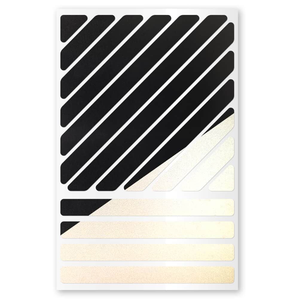 Maße der Sticker: 10 variierende Streifen (gesamtes Motiv 101 mm x 102 mm), 2 Dreiecke je 14 mm x 15 mm, 4 Streifen je 101 mm x 10 mm