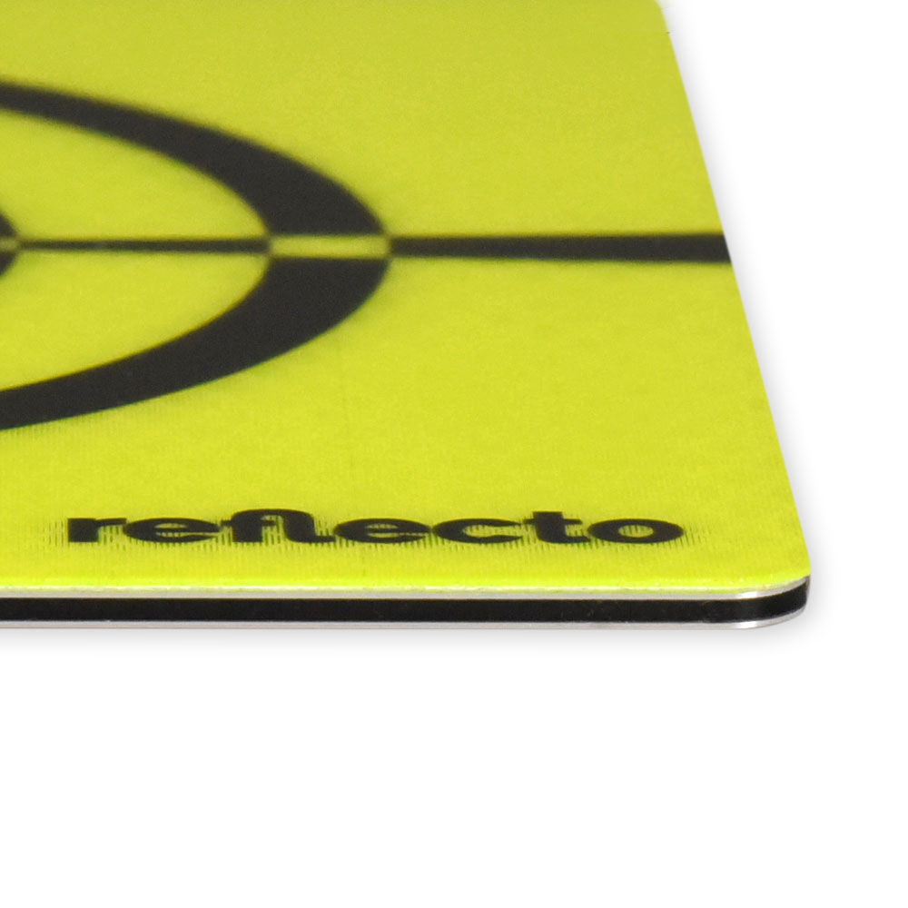 Dank der fluoreszierenden Farbe sind die Zielmarken auch auf hellen Untergründen sofort sichtbar. Das Fadenkreuz ist in schwarzer Farbe 100 % mittig auf die quadratische Reflektormarke gedruckt und verfügt über einen fett gedruckten Außenradius für eine bessere Wahrnehmung aus größerer Entfernung.