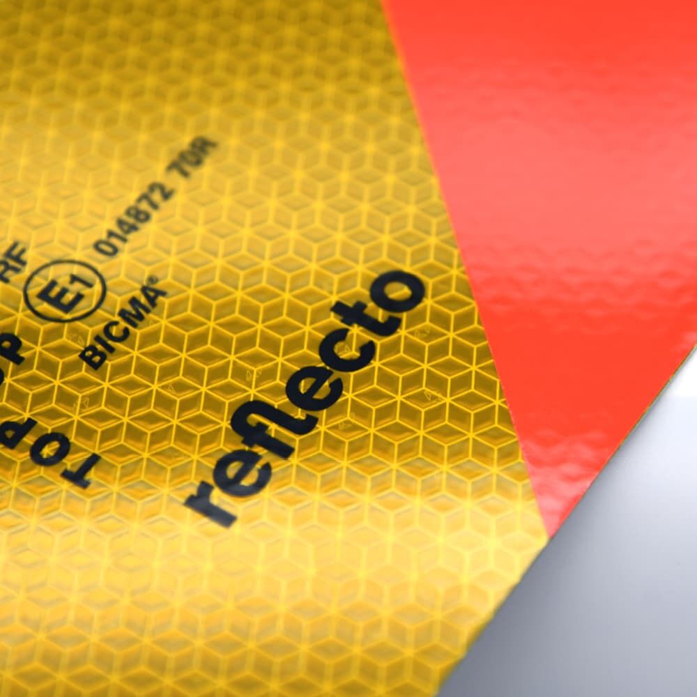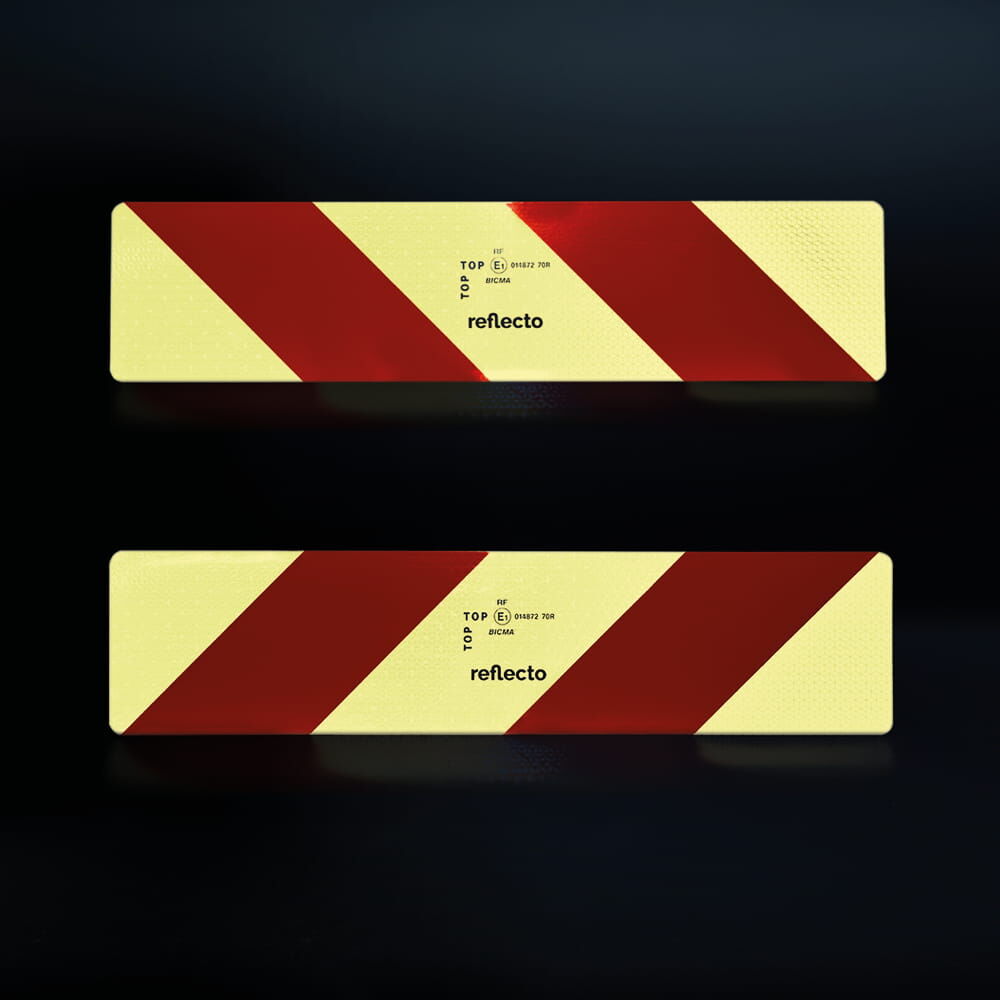 Die gelben Streifen bestehen aus leistungsstarker Reflexfolie der Rückstrahlklasse RA3 (Aufbau C), während die roten Streifen aus fluoreszierender Folie sind. Somit entspricht die Heckwarnmarkierung der ECE-Regelung 70.01 (Klasse 1).