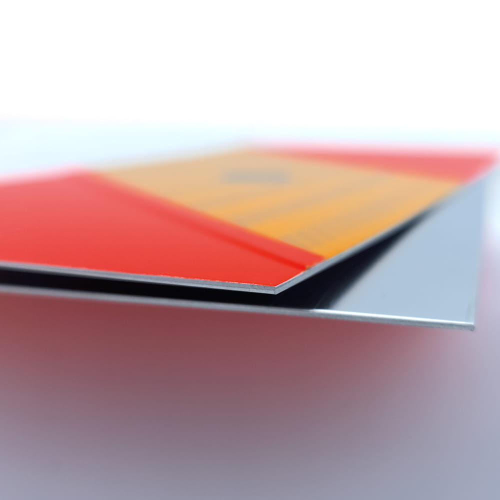 Heckwarntafel für Zugmaschinen nach ECE 70.01, als selbstklebender Aufkleber, als beklebte 1,0 mm starke Aluminiumplatte oder auf Magnetfolie. Gelbe Hochleistungsreflexfolie (3M™ Diamond Grade™ DG³ RA3/C Serie 4091) auf tagesleuchtender Folie in Rotorange.