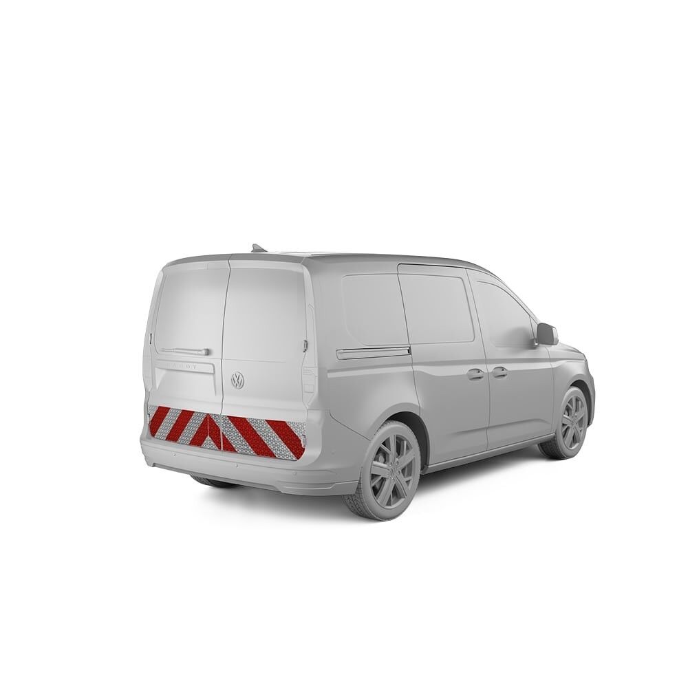Die passgenauen Warnmarkierungszuschnitte für den VW Caddy V ab Baujahr 2021 (Hecktür oder Heckklappe) sind als Set für die vollständige Markierung ihres Fahrzeugs erhältlich oder als einzelne Komponenten für Heck, Front oder die Seiten.