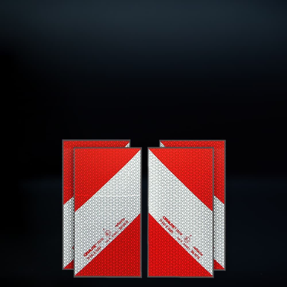 Bestellen Sie beispielsweise das vierteilige Set mit den Maßen 141 x 564 mm und Sie erhalten zwei rechtsweisende und zwei linksweisende Streifen zur ordnungsgemäßen Kenntlichmachung eines Fahrzeugs an Front und Heck.