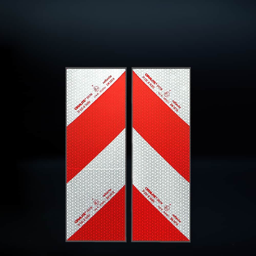 Bestellen Sie beispielsweise das vierteilige Set mit den Maßen 141 x 564 mm und Sie erhalten zwei rechtsweisende und zwei linksweisende Streifen zur ordnungsgemäßen Kenntlichmachung eines Fahrzeugs an Front und Heck.